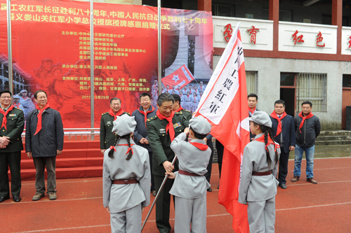 2015年3月29日,担任全国红军小学建设工程理事会副理事长的杨建华为遵义市娄山关红军小学授旗。