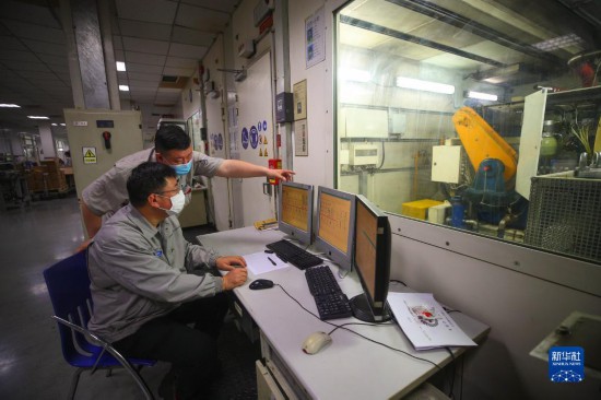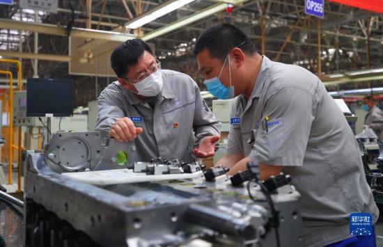 一汽解放大连柴油机有限公司的高级技师鹿新弟(左)在车间与同事交流(2020年5月7日摄)。新华社记者 龙雷 摄