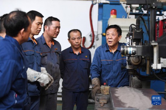 6月17日,艾爱国(左一)在湖南湘潭湘钢高级技工学校焊接实习基地检查学生的焊接作业。新华社记者 薛宇舸 摄