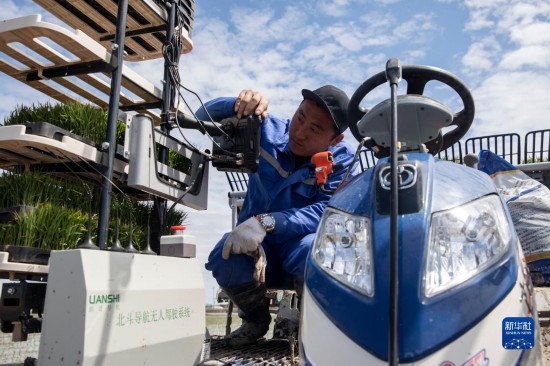在北大荒集团红卫农场有限公司智慧农业先行示范区内,工作人员设置无人驾驶插秧机工作路径(5月11日摄)。据介绍,无人驾驶智能插秧机应用北斗卫星定位系统,田间作业时可实现自动避障、掉头和转弯。新华社记者 张涛 摄