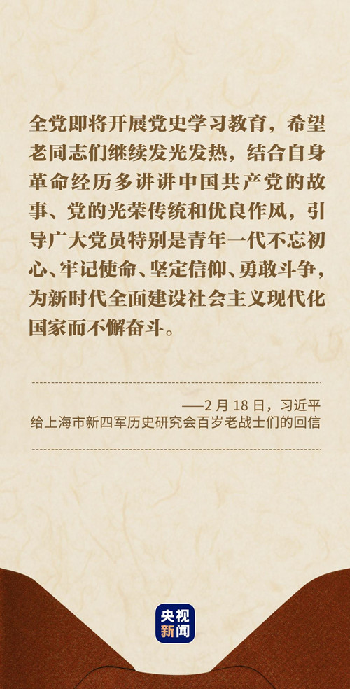 习近平总书记在回信中说:“你们青年时代就投身革命,为党和人民事业英勇奋斗,期颐之年仍心系党史宣传教育,深厚的爱党之情令人感佩。”